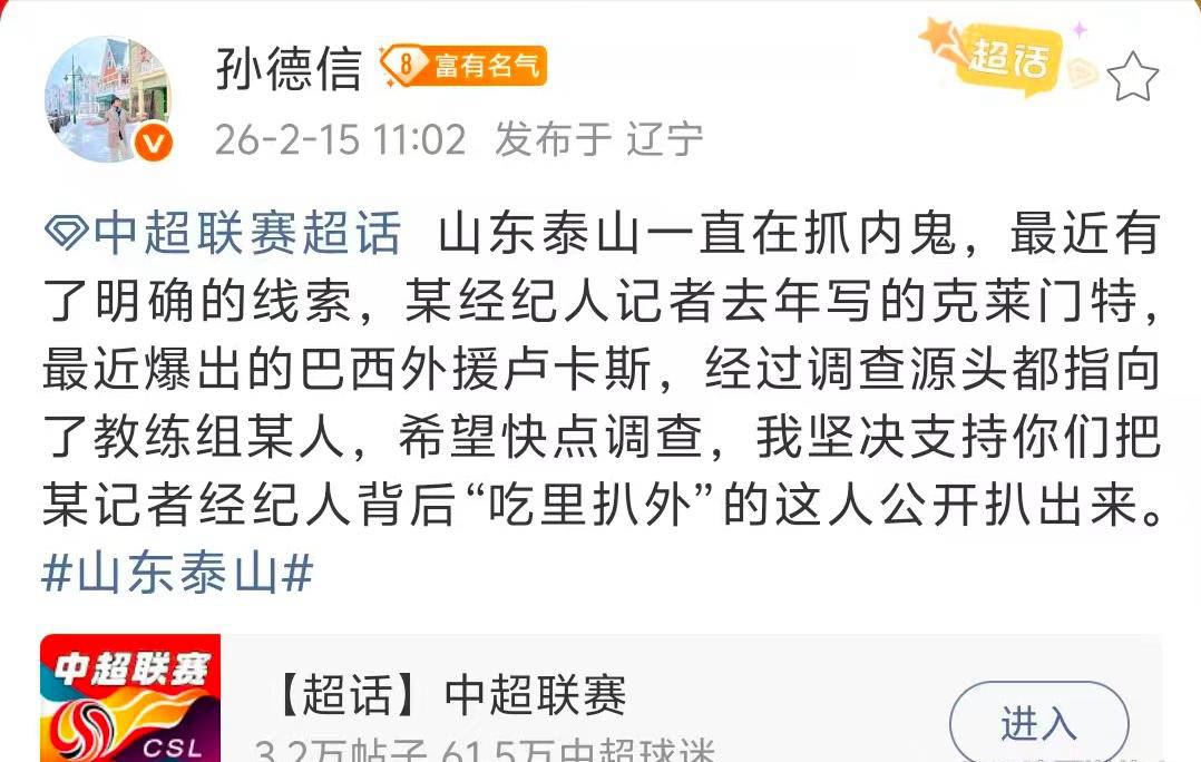 德信,德信体育,德信官方网站,德信体育官网注册,德信体育官网链接,德信体育app下载,德信体育官网,德信体育注册,德信体育网址,德信体育入口,德信体育靠谱吗,德信体育注册链接,德信官网,德信体育平台北京时间2月15日,山东泰山队在引进外援中卫的过程中,再次成为中超转会窗口内备受关注的话题。然而,让人费解的是,每当泰山队有新绯闻球员传出消息时,总会被外界第一时间曝光。对此,知名体育记者孙德信发表了一条重磅消息。他透露,山东泰山俱乐部一直在严查队内有关引援消息泄露的“内鬼”,近期更锁定了明确线索。根据调查显示,之前多次爆料泰山队引援情况的消息,无论是关于经纪人披露的克莱门特,还是最近曝光的卢卡斯,其源头最终都指向了教练组中的某位成员。孙德信期待俱乐部能够尽快查清事实,将这位涉嫌“吃里扒外”的教练组人员公开曝光并予以处理。